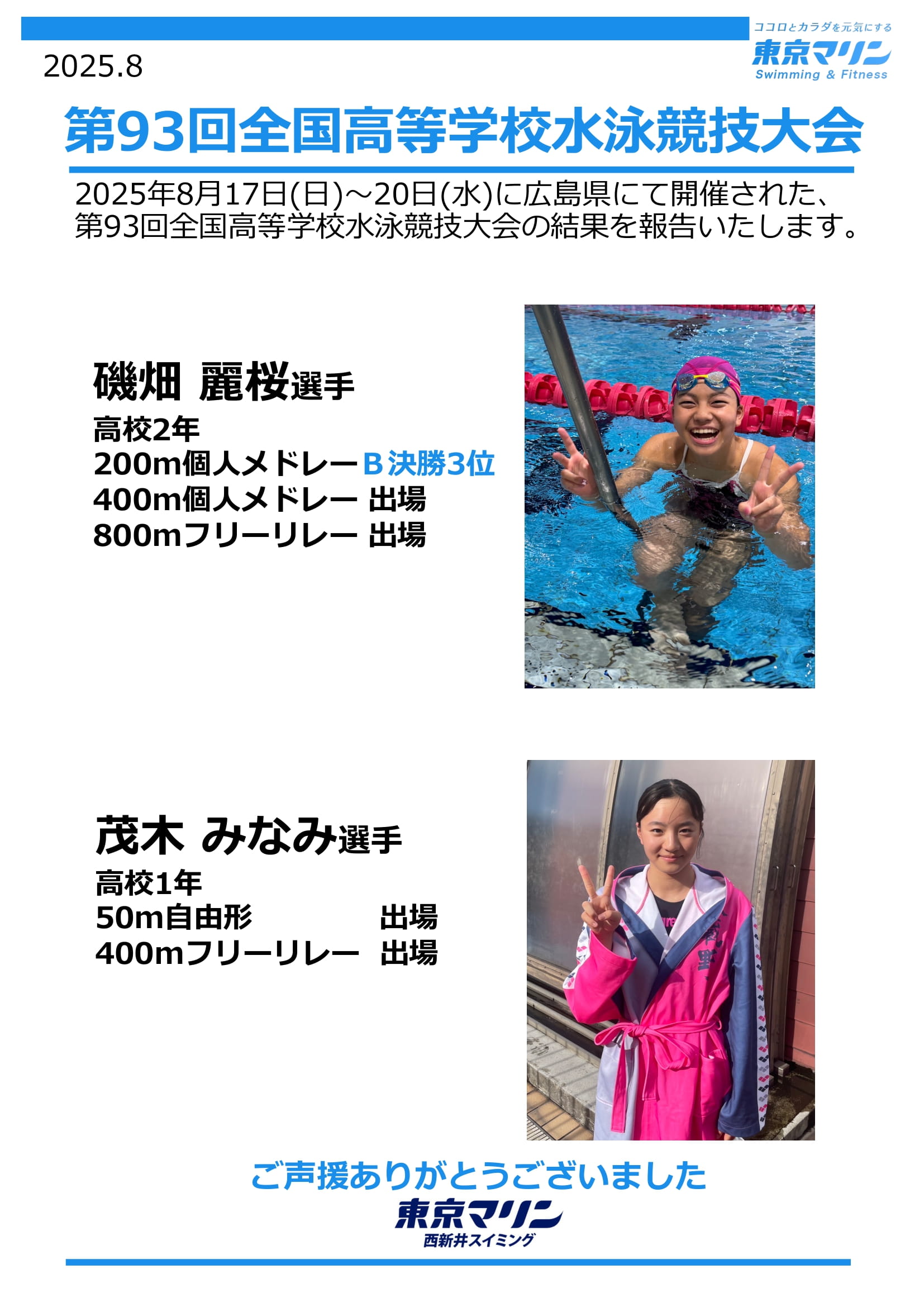 2025年8月17日(日)~20日(水)に広島県広島市のひろしんビッグウェーブにて開催された、第93回全国高等学校水泳競技大会の結果を報告いたします。