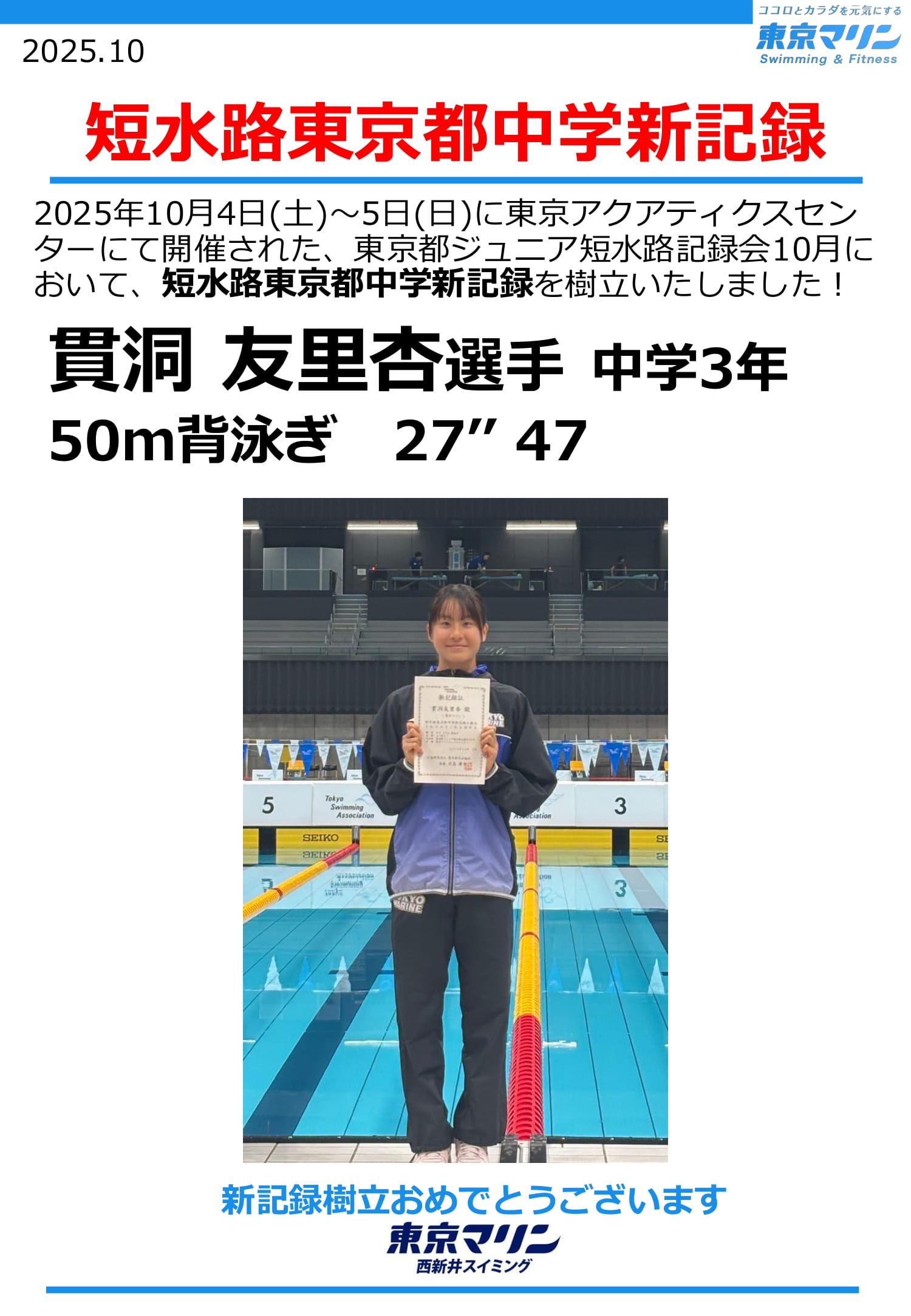2025年10月4日(土)~5日(日)に東京アクアティクスセンターにて開催された、東京都ジュニア短水路記録会10月において、短水路東京都中学新記録を樹立いたしました!