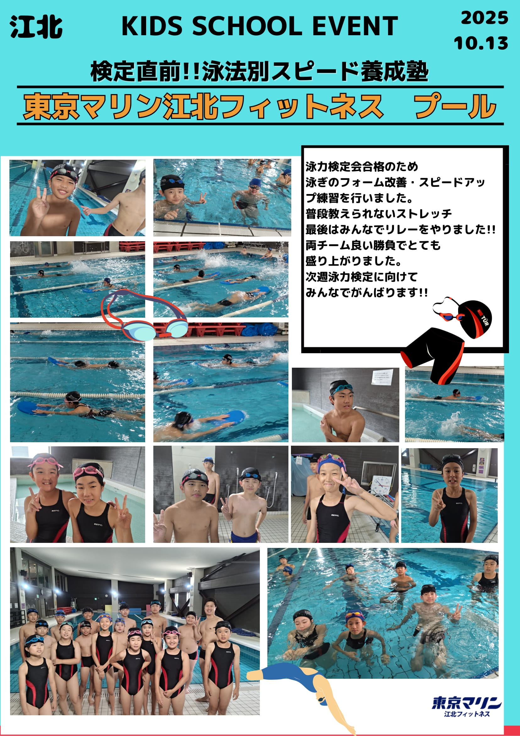2025年10月13日(祝月)に、江北フィットネスにて泳力検定会合格の為の泳ぎのフォーム改善・スピードアップ練習を行いました。