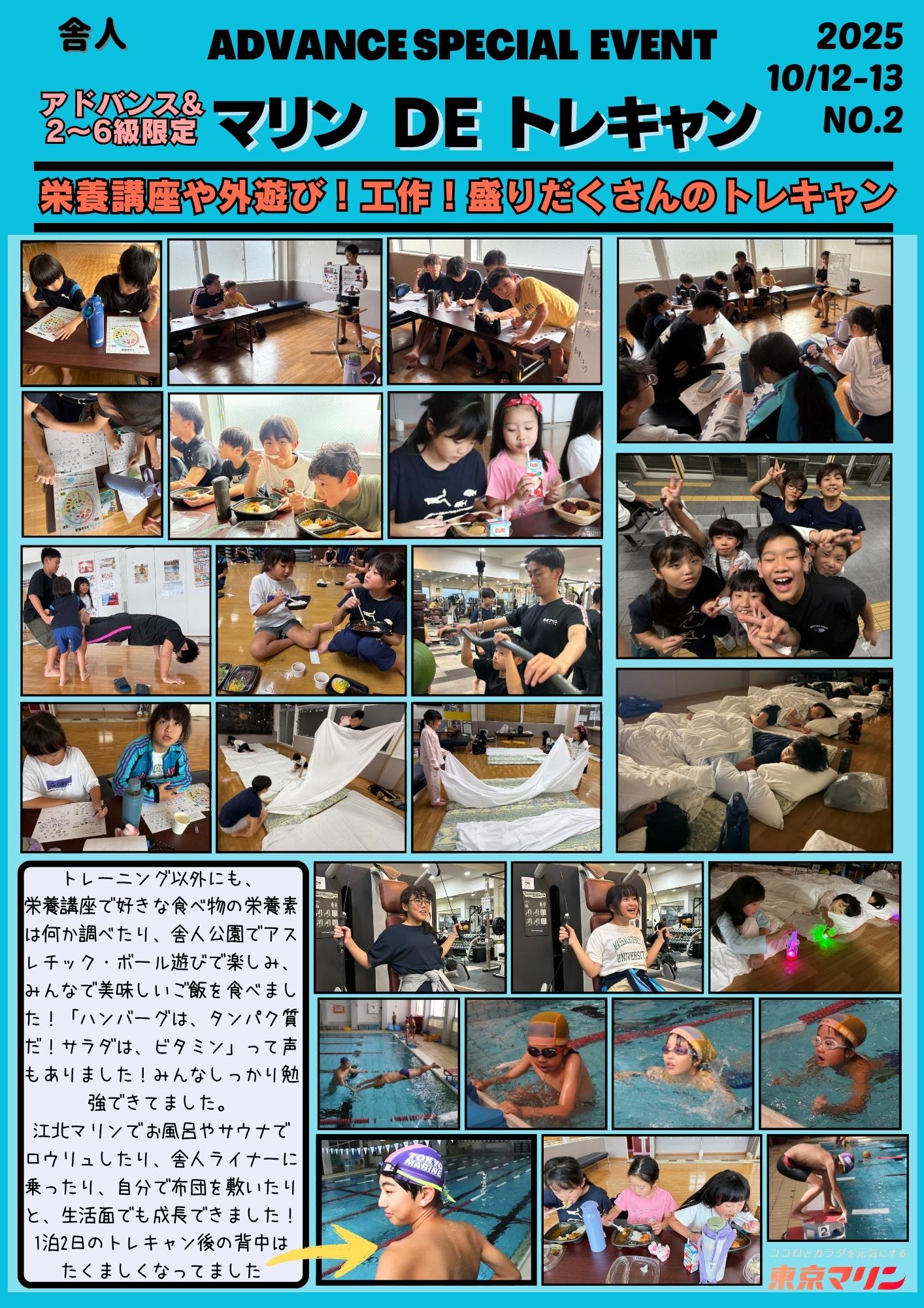 トレーニング以外にも、栄養講座で好きな食べ物の栄養素は何か調べたり、舎人公園でアスレチック・ボール遊びで楽しみ、みんなで美味しいご飯を食べました。
