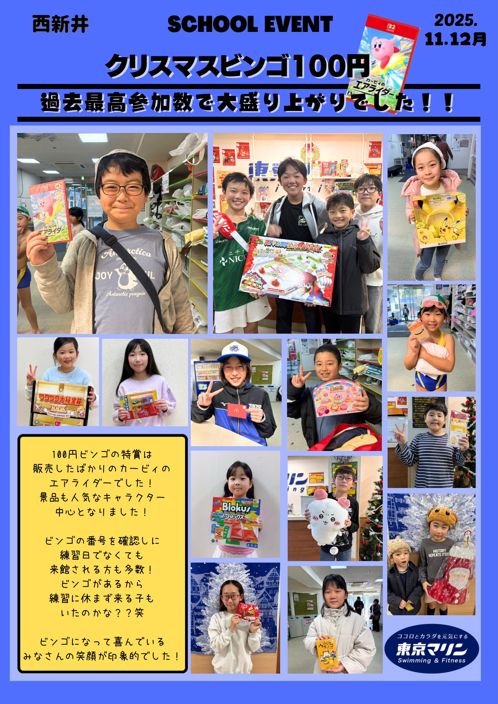 500円ビンゴの景品は子ども達から欲しい!と声が多かった「Switch2」や「ラブブ」、「ポケモンカード」などを用意しました。特にSwitch2が当たった時は館内みんなで大盛り上がりでした!