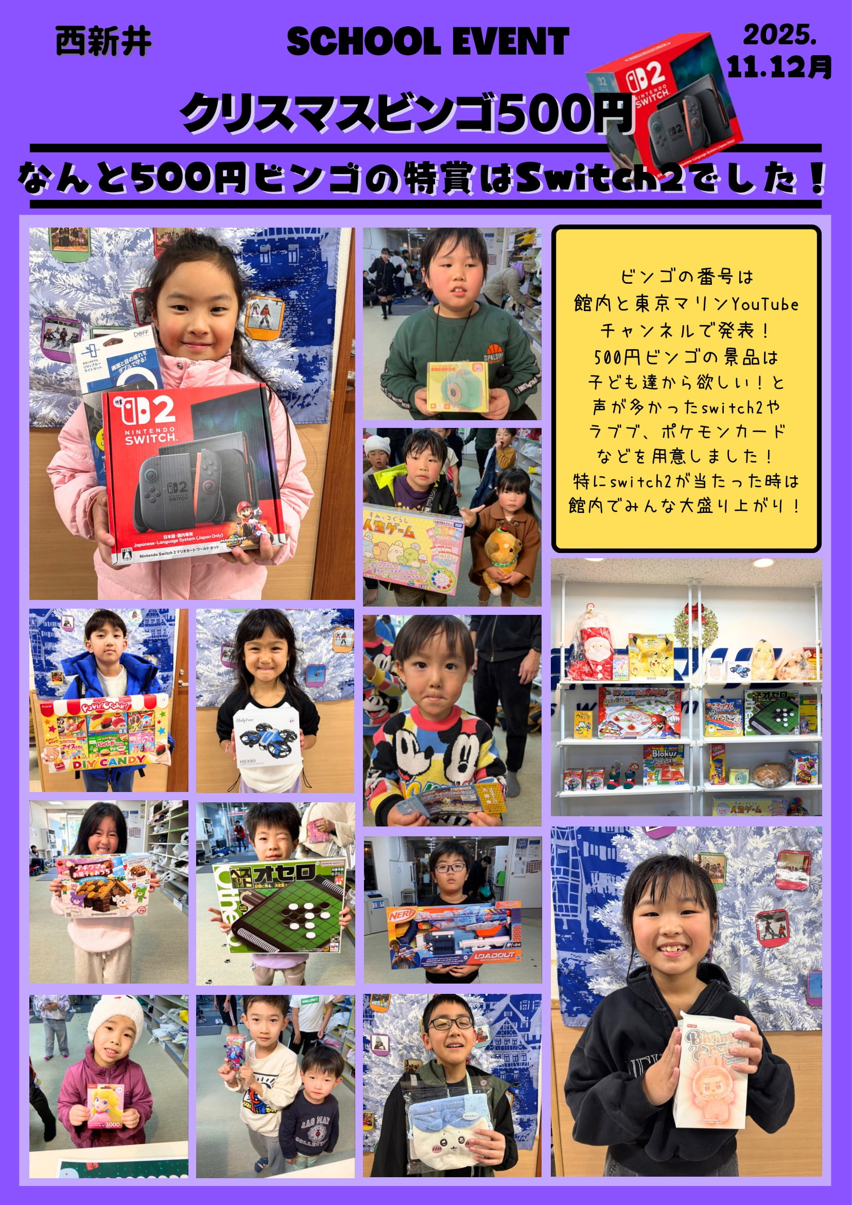 500円ビンゴの景品は子ども達から欲しい!と声が多かった「Switch2」や「ラブブ」、「ポケモンカード」などを用意しました。特にSwitch2が当たった時は館内みんなで大盛り上がりでした!
