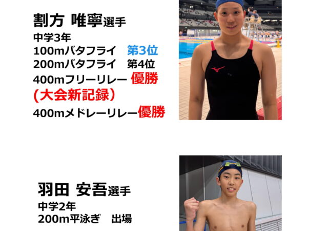 2025年8月16日(土)~19日(火)に鹿児島県鹿児島市の鴨池公園水泳プールにて開催された、第65回全国中学校水泳競技大会の結果を報告いたします。 【西新井所属】 割方 唯寧 100mバタフライ 第3位 200mバタフ…